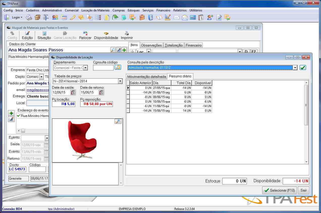 Gestão de locação de materiais para festas com controles de entrega e recolhimento dos itens além da disponibilidade futura de estoque.