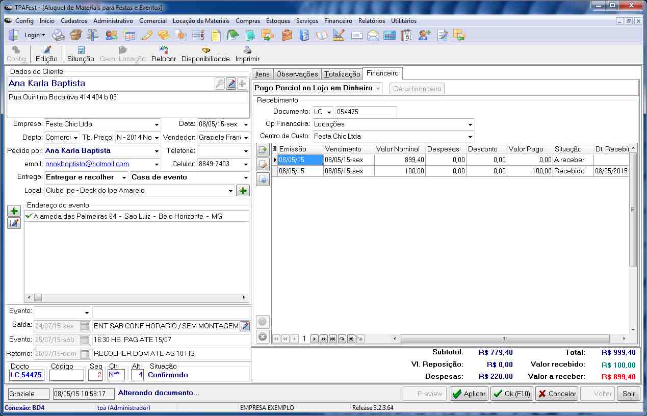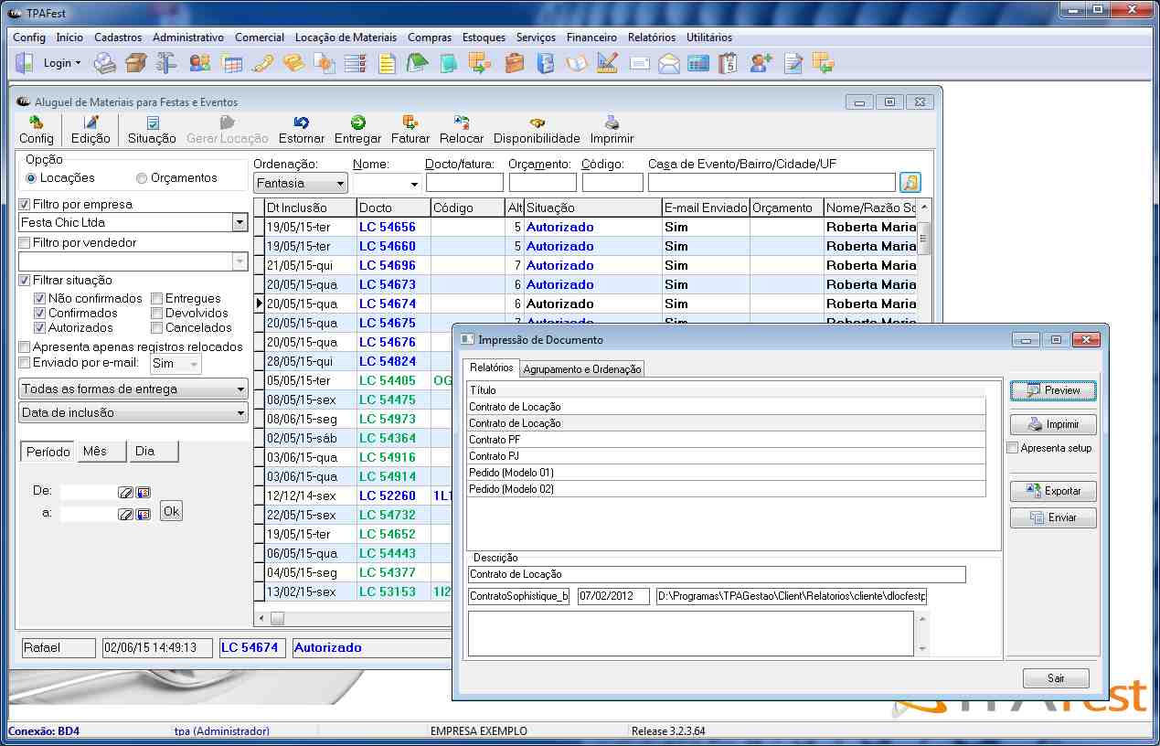 » Locação de materiais com data de saída, data da festa e data de retorno;